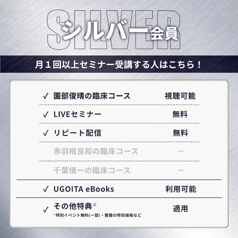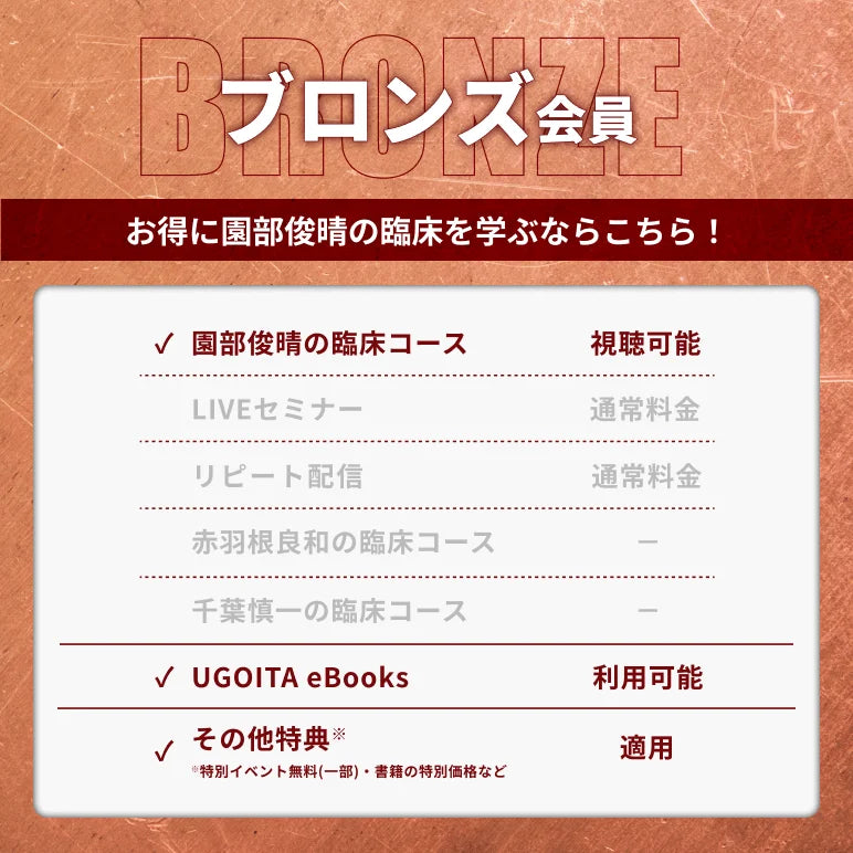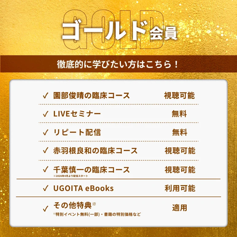 ゴールド会員になると、『赤羽根良和の臨床コース』や『千葉慎一の臨床コース』などUGOITAオリジナルの独占コンテンツを視聴することができます。