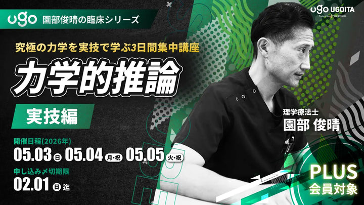 そんな園部の30年の臨床知見の一部はUGOITA PLUSのオリジナルコンテンツ『園部俊晴の臨床コース』で解説しているが、この『力学的推論シリーズ』では、より『力学』に特化した内容を詰め込んでいる。